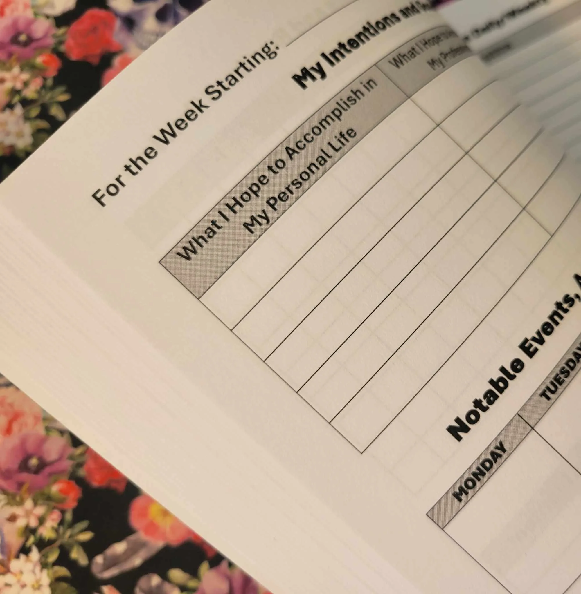 This tool includes 52 weeks of space to plan and reflect on your week. Sections include: